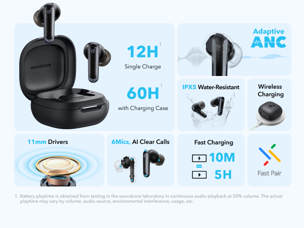 - Adaptive ANC technology that automatically adjusts to ambient noise.
