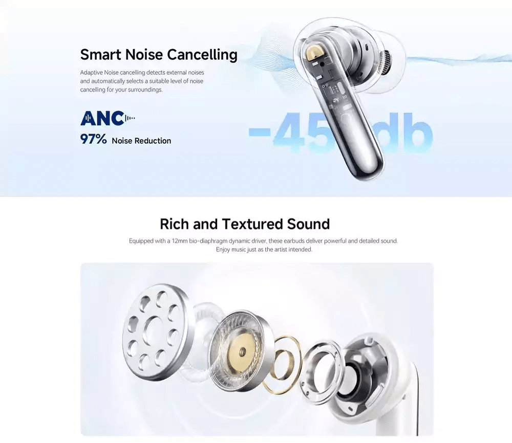 - ANC: Up to 45 dB adaptive noise cancellation